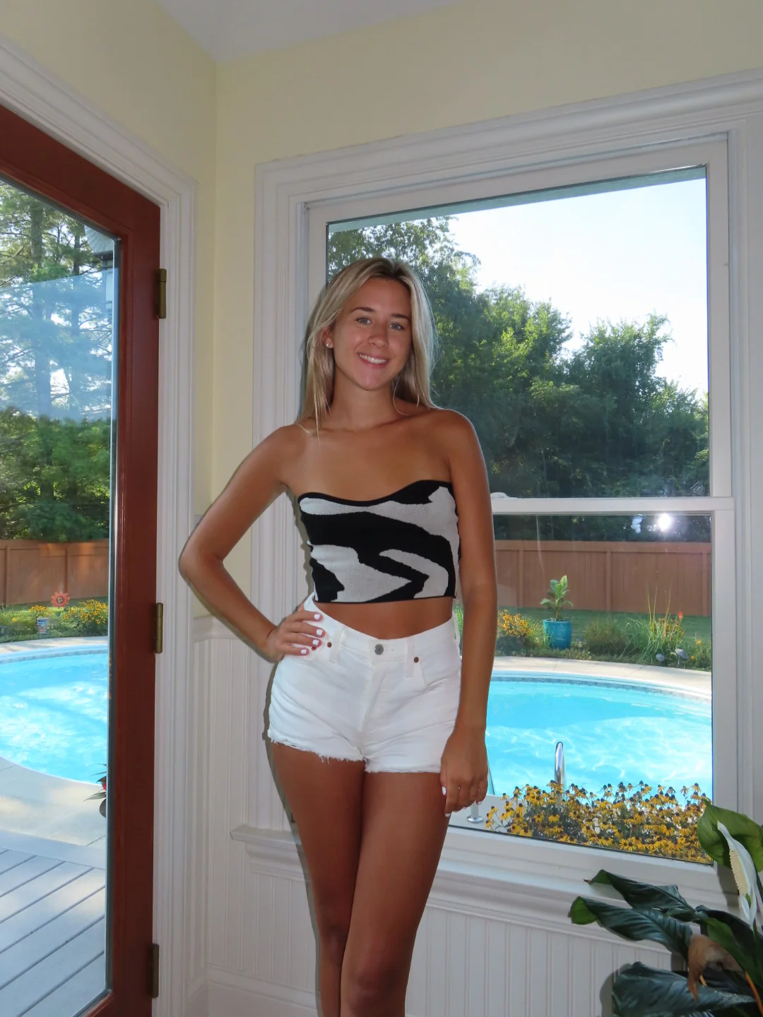 Turn heads from sunset to nightlife in our After Dark Knit Tube Top, the perfect mix of bold and beachy. Featuring a sleek black-and-white zebra knit pattern, this strapless top hugs your figure in all the right places for a confident, curve-loving fit.