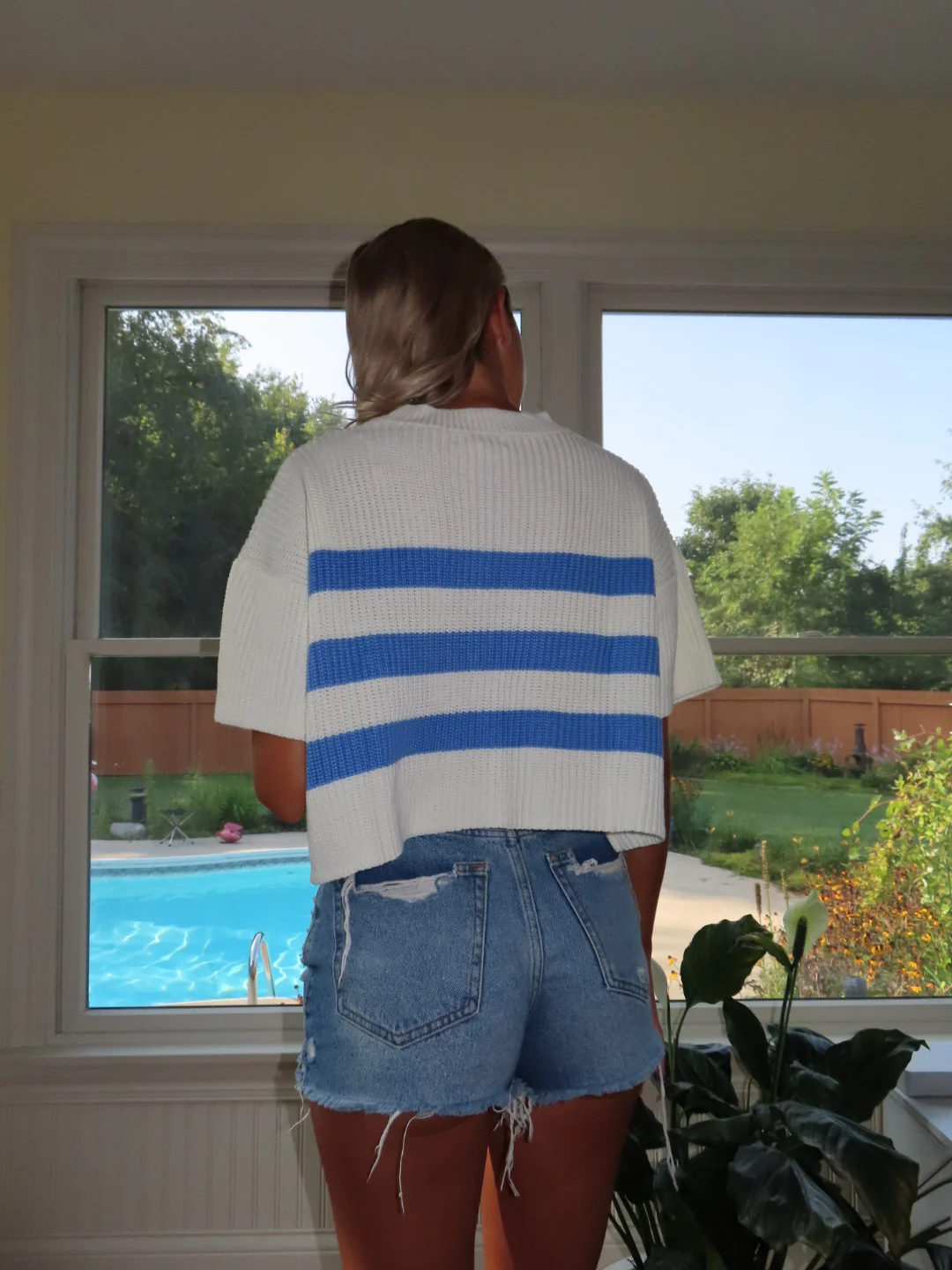 Elevate your wardrobe with our timeless White & Blue Striped Short Sleeve Top. Made from high-quality materials, this classic top features a comfortable fit, short sleeves, and a versatile striped pattern perfect for any occasion.