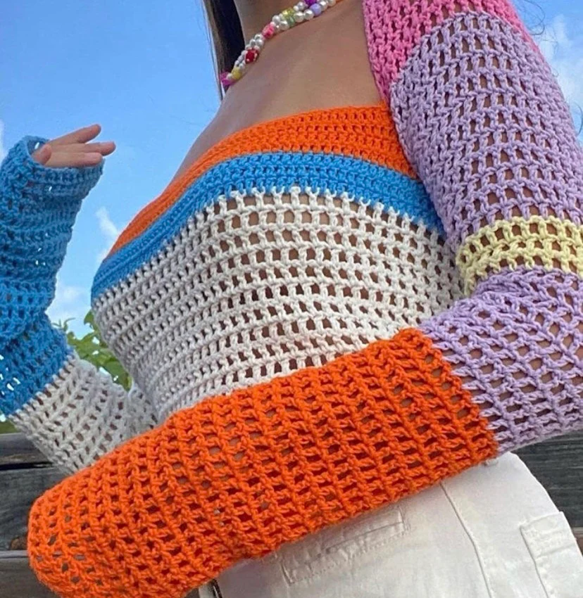 This colorful open-knit crop top features a rainbow stripe pattern inspired by golden hour skies. With soft pastel hues of pink, orange, yellow, blue, and white, it’s the perfect mix of cozy and carefree. The breathable crochet fabric and long sleeves make it ideal for throwing over your bikini after a beach day or styling with denim for a laid-back coastal look.