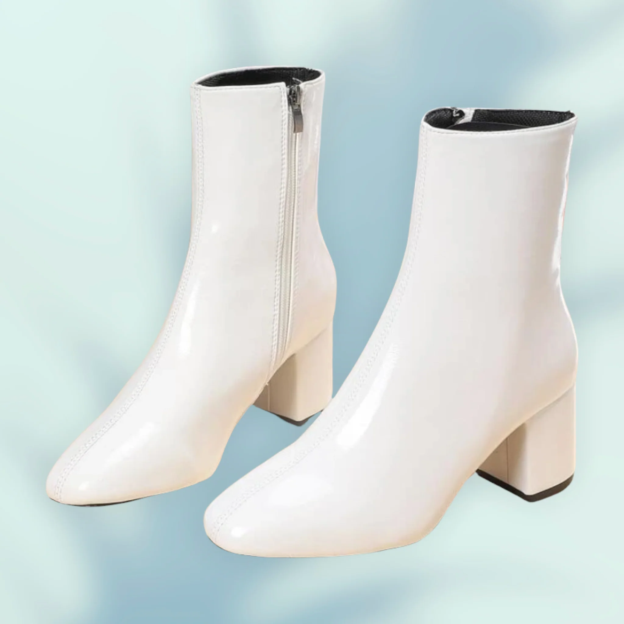 Step into timeless style with our White Block Heel Ankle Boots — a chic and versatile staple for every wardrobe. Featuring a sleek patent finish, these boots are designed with a modern square toe, side zipper closure for easy wear, and a comfortable mid-block heel that adds height without sacrificing comfort.
